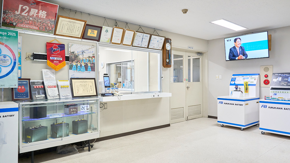 自動車用鉛蓄電池や産業用蓄電池の製造拠点です。産業用では鉄道用・航空機用・防災機器用・人工衛星用などの蓄電池を製造しております。工場内には研究施設もあり、新製品の開発にも取り組んでおります。